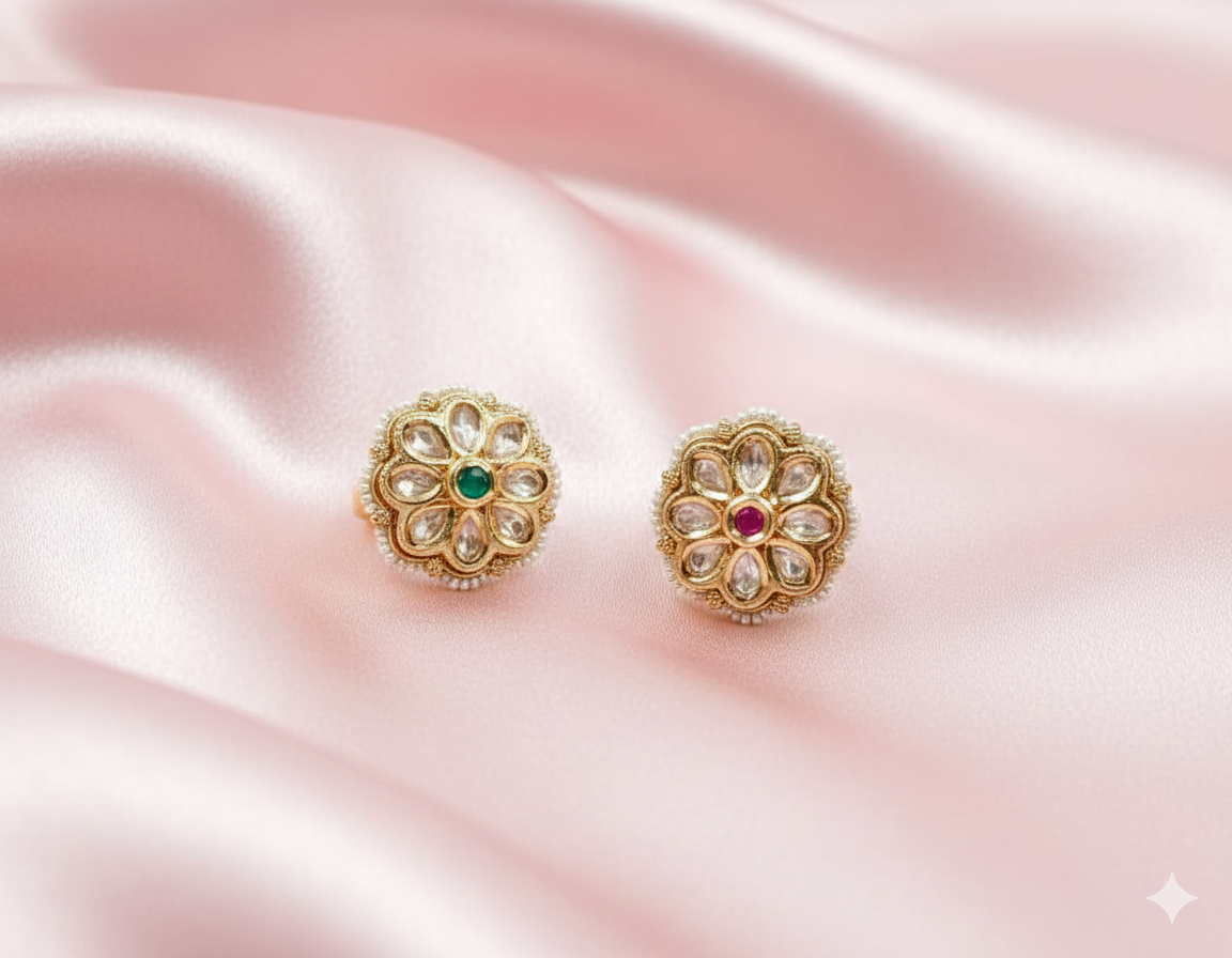 Channel timeless elegance with the Royal Star Kundan Ring. This statement piece centers on a vibrant star-motif gemstone—available in regal emerald or ruby—encircled by clear teardrop-shaped Kundan stones. The gold-toned floral arrangement is finished with a traditional halo of tiny white seed pearls. Featuring an adjustable band for a comfortable fit, this ring is an essential accessory for weddings, festivals, and special cultural celebrations.