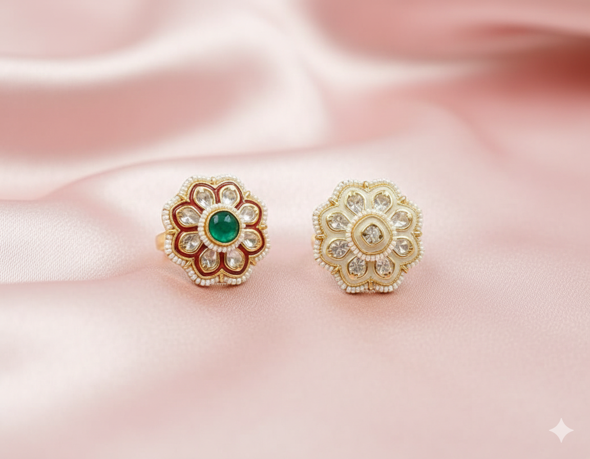 Channel timeless elegance with the Royal Star Kundan Ring. This statement piece centers on a vibrant star-motif gemstone—available in regal emerald or ruby—encircled by clear teardrop-shaped Kundan stones. The gold-toned floral arrangement is finished with a traditional halo of tiny white seed pearls. Featuring an adjustable band for a comfortable fit, this ring is an essential accessory for weddings, festivals, and special cultural celebrations.