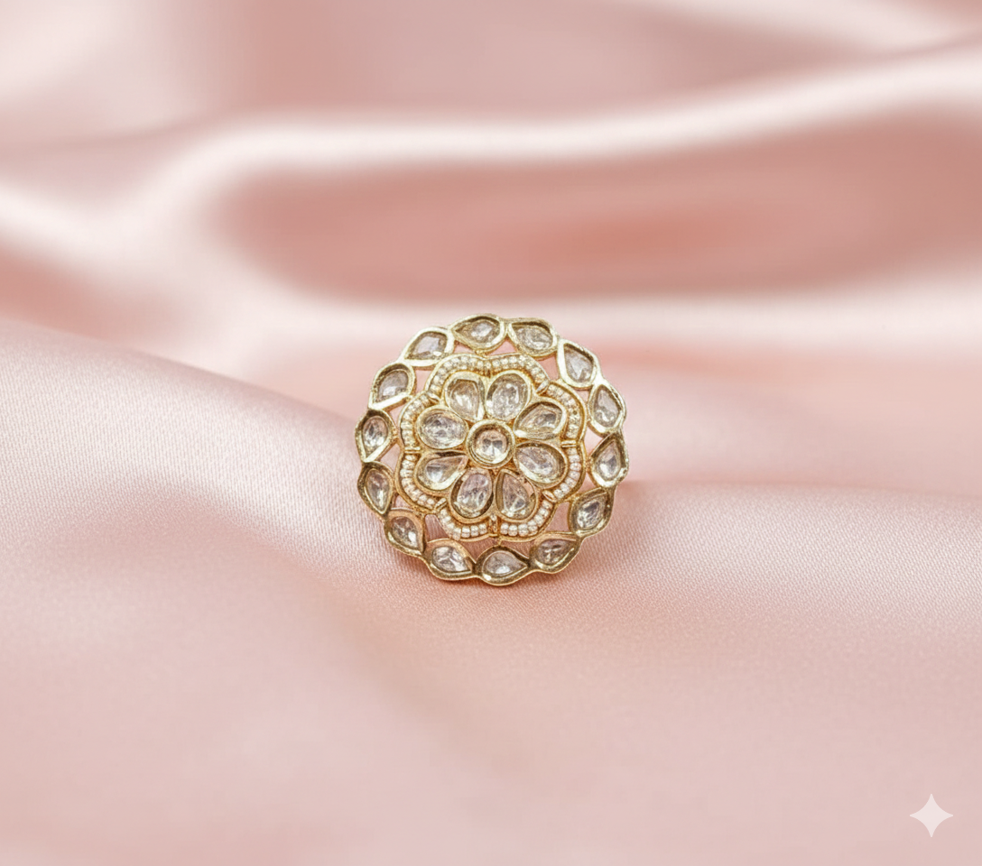 Embrace the timeless charm of Indian heritage with our Royal Star-Motif Kundan Ring. This masterpiece is meticulously designed with a striking central gemstone serving as the focal point. Surrounding the center are teardrop-shaped Kundan stones, arranged in a blooming floral pattern that captures the essence of vintage royalty. The outer edge is finished with a crown of miniature white seed pearls. Crafted with a high-quality gold-toned finish and an adjustable band, this ring ensures a perfect, comfortable fit for any finger size.