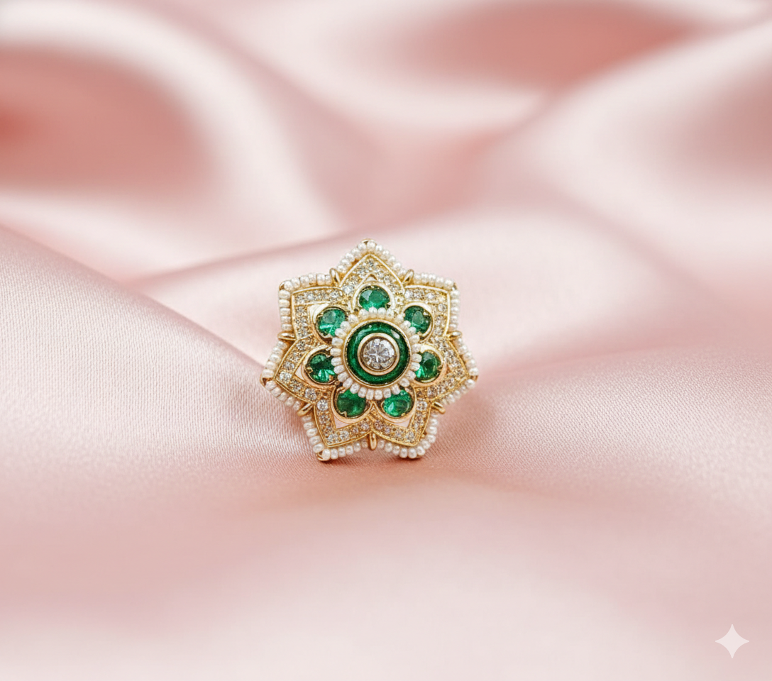 Embrace the timeless charm of Indian heritage with our Royal Star-Motif Kundan Ring. This masterpiece is meticulously designed with a striking central gemstone—available in vibrant emerald or deep ruby—that serves as the radiant focal point. Surrounding the center are teardrop-shaped Kundan stones, arranged in a blooming star-like floral pattern that captures the essence of vintage royalty. To add a touch of delicate elegance, the outer edge is finished with a crown of miniature white seed pearls. Crafted with a high-quality gold-toned finish and an adjustable band, this ring ensures a perfect, comfortable fit for any finger size.