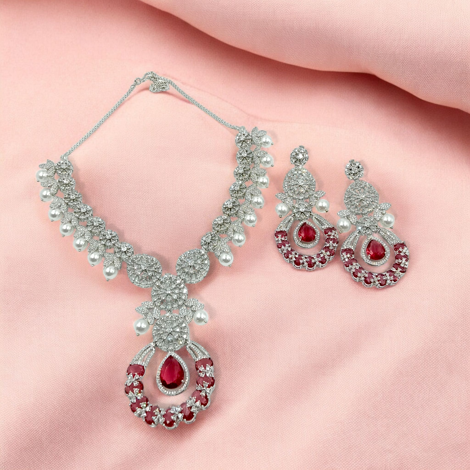 Embellished with premium AD stones and featuring a radiant ruby hue, this necklace perfectly blends luxury with timeless beauty.