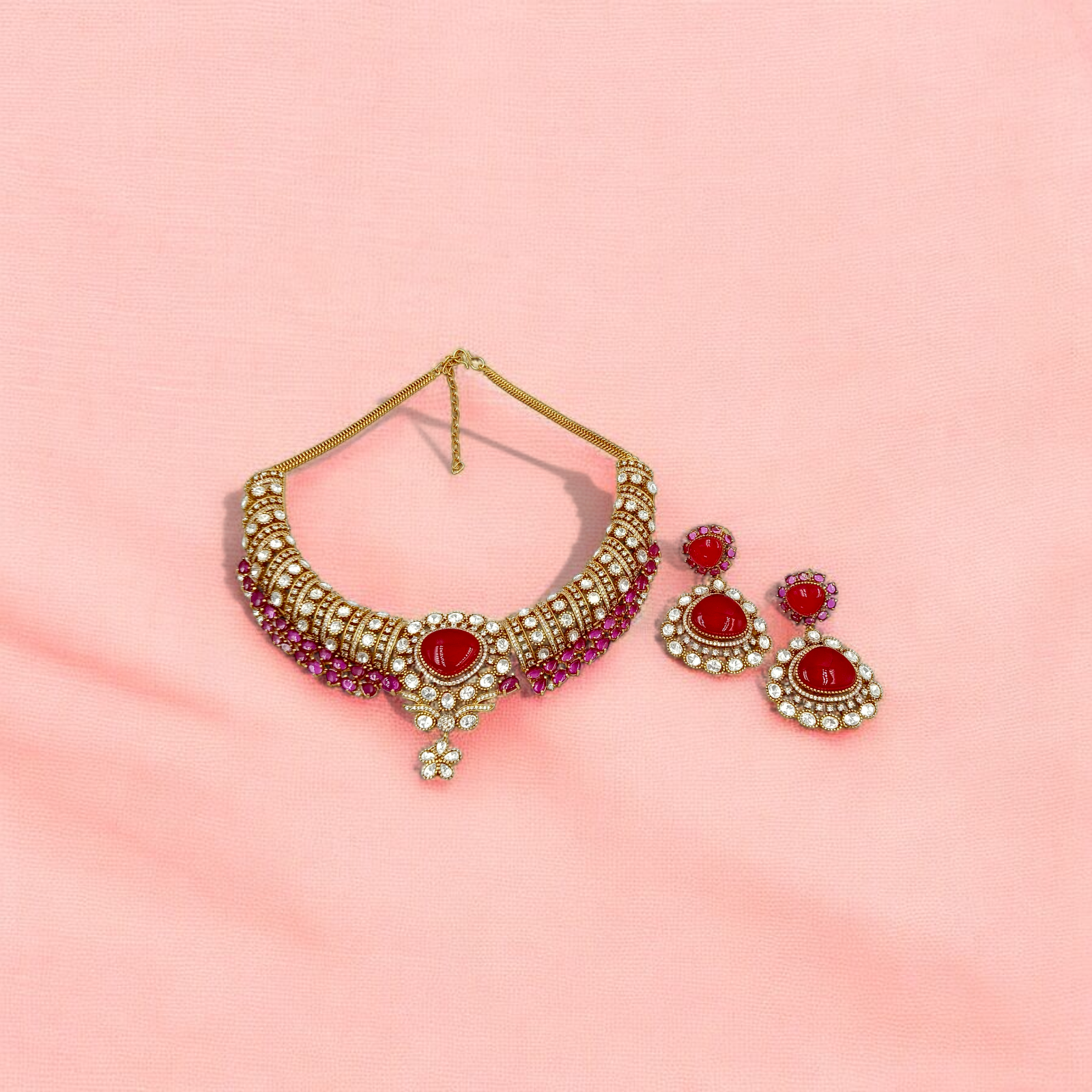Crafted with premium AD stones in a rich ruby hue, this necklace exudes elegance and glamour.