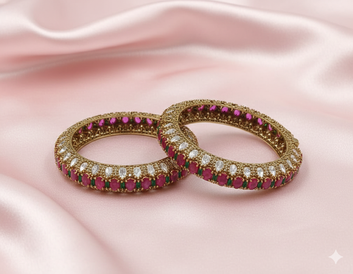 Delicate green accent detailing adds contrast and elevates the overall design, while the intricate gold framework gives it a timeless, heritage-inspired appeal. The exact ruby pink colour brings warmth and sophistication, making this bangle ideal for weddings, festive celebrations, and traditional occasions.