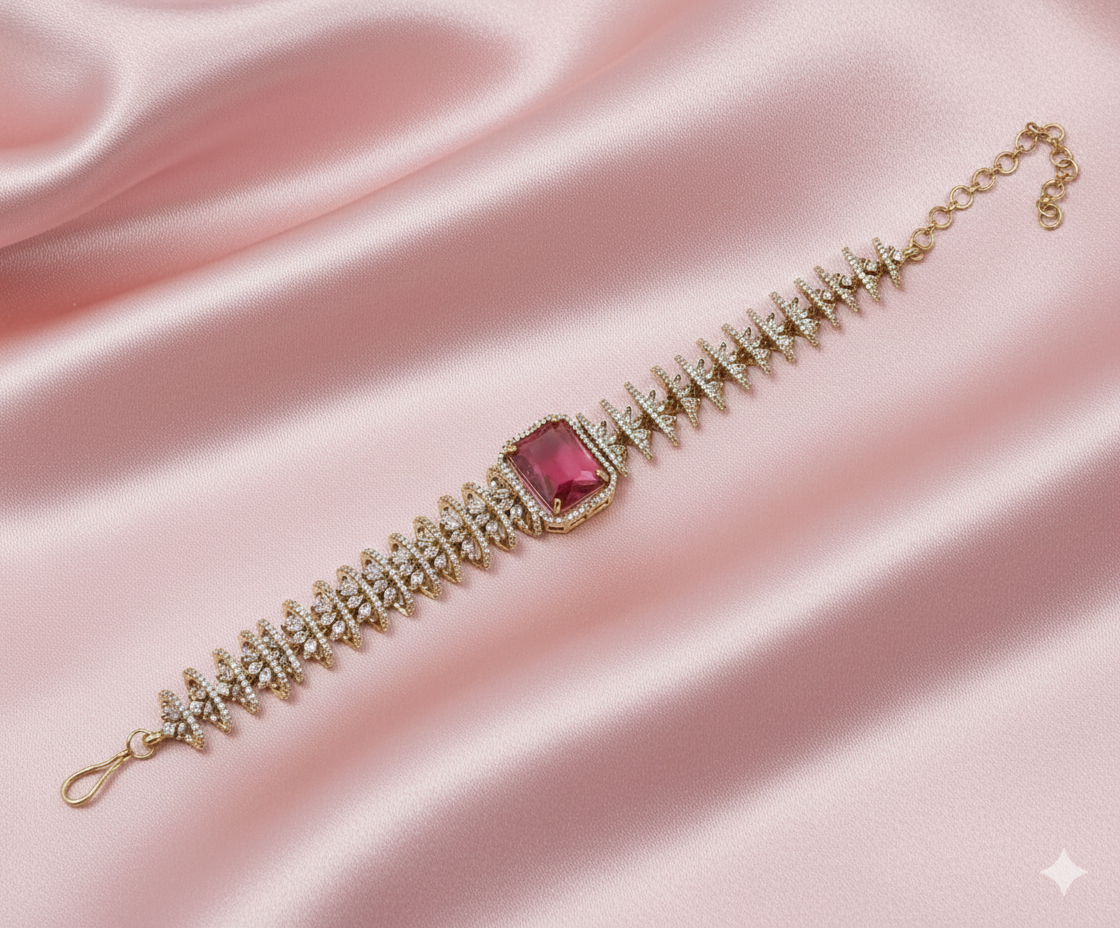 The design is beautifully highlighted by a striking deep red central stone, set in an elegant frame that creates a captivating focal point. The sleek structure is finished with an adjustable chain closure, ensuring a comfortable and secure fit for all wrist sizes.