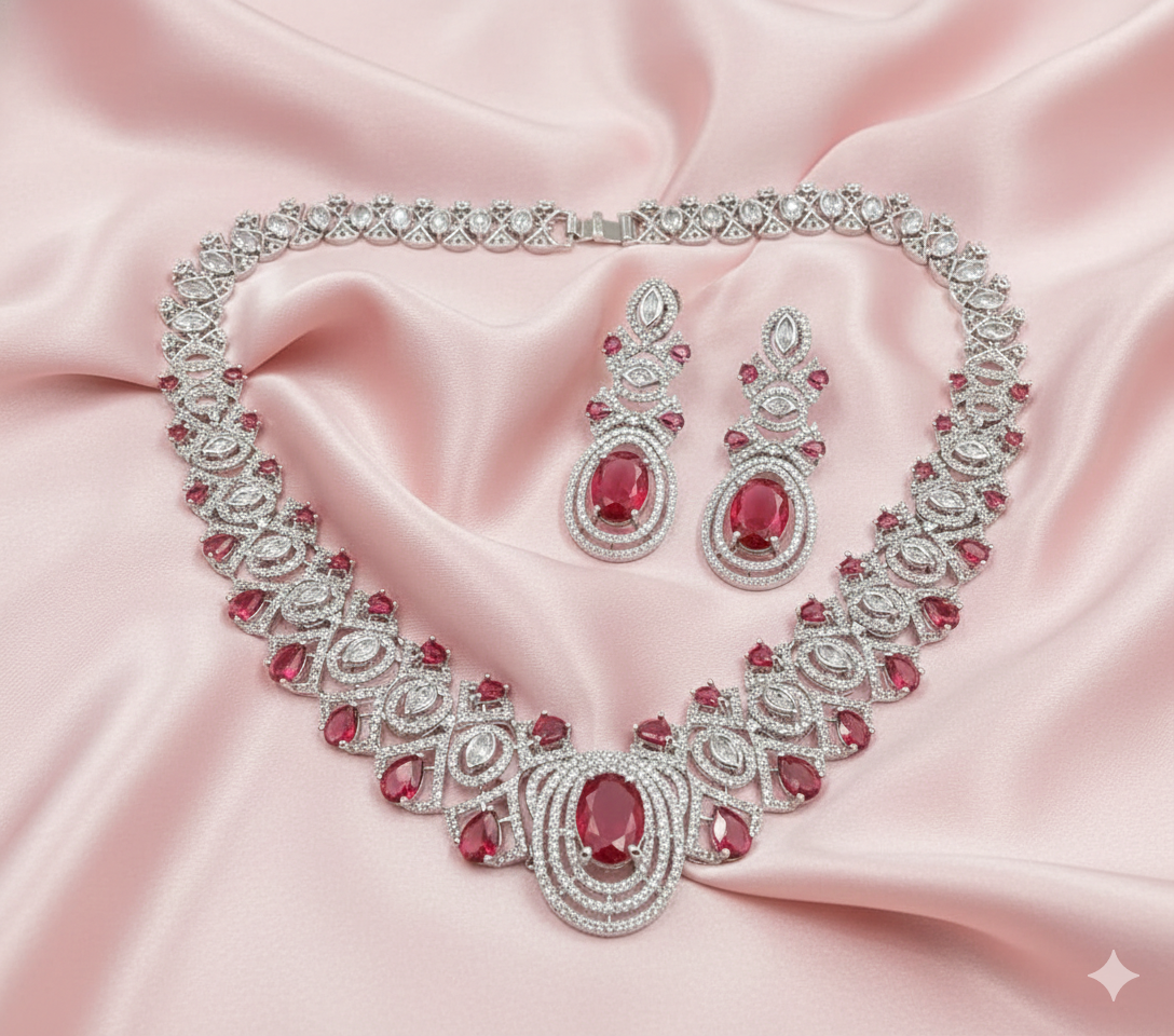 This Ruby Red AD Necklace Set features a premium silver polish base adorned with sparkling white American Diamonds and rich ruby red stones. The elegant oval center stone adds a royal touch, while the matching drop earrings complete the look. A perfect choice for weddings, receptions, and festive occasions.