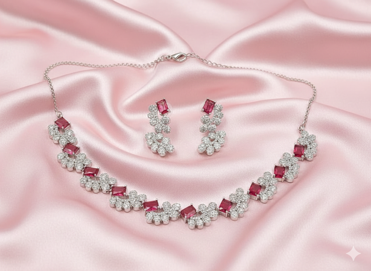 Elevate your jewelry repertoire with the Royal Medallion Series. This set is a masterclass in traditional artistry combined with contemporary sparkle. The necklace features a prominent circular centerpiece intricately set with high-grade American Diamonds, finished with a graceful teardrop dangle. The neckline is adorned with a series of petal-shaped links, each cradling a brilliant-cut stone. Paired with matching floral-inspired drop earrings, this set ensures a complete, royal look for weddings and grand galas