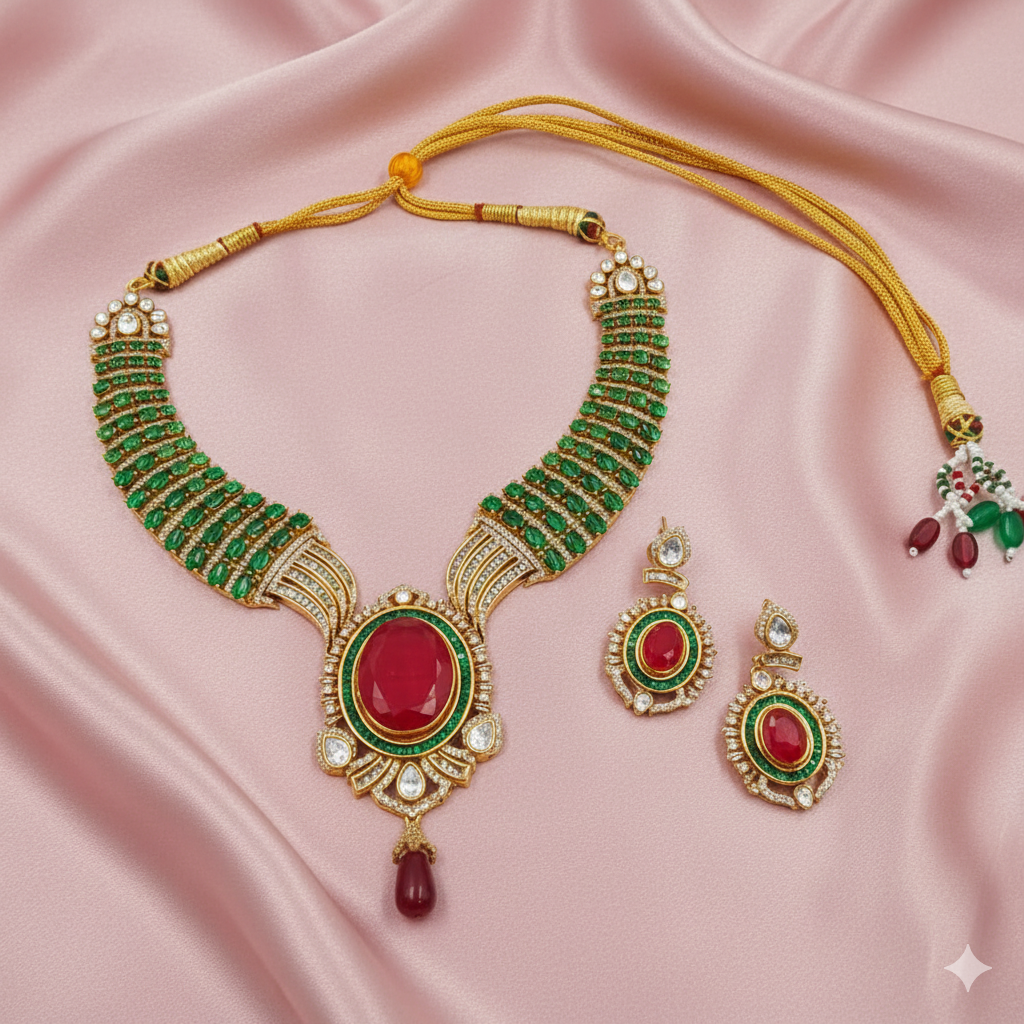 Make a royal statement with this exquisitely crafted Moissanite Hasli Necklace Set, designed to elevate traditional and bridal looks. The necklace showcases a striking deep ruby red oval centerpiece, framed with fine white moissanite stones that add a radiant sparkle. The hasli is beautifully layered with emerald green stones, giving it a rich and regal appeal.