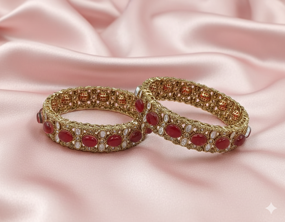 The intricate lattice-style craftsmanship and detailed gold work give the bangle a regal, heritage-inspired look. The exact deep ruby red colour adds richness and depth, making it perfect for weddings, festive occasions, and statement ethnic styling.