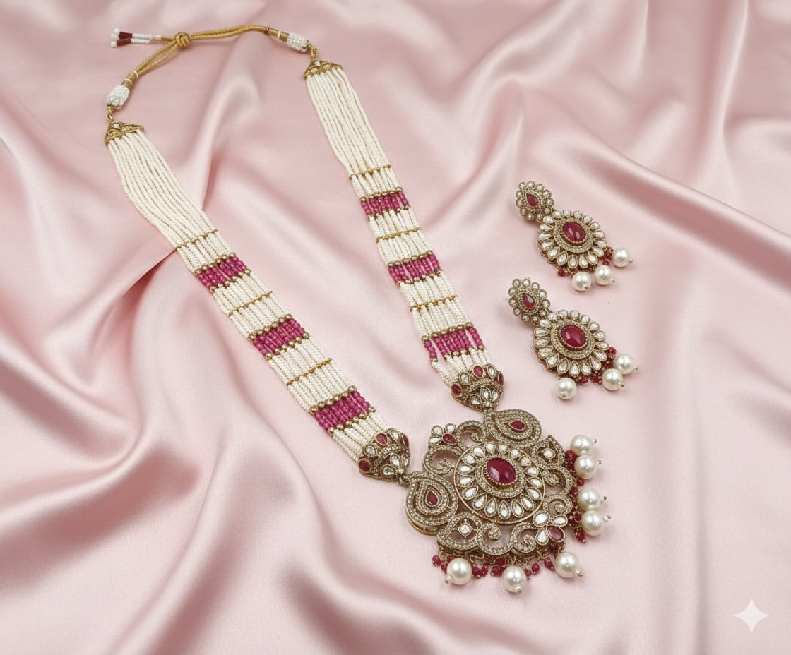 The Necklace: A multi-strand long necklace (Haram) composed of delicate off-white seed pearls, punctuated by structured segments of ruby-pink beads. The centerpiece is a magnificent, oversized floral pendant featuring detailed filigree work and teardrop pearl hangings.