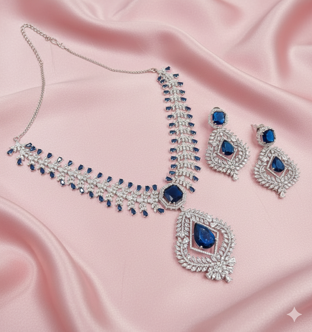 Elevate your jewellery collection with the Sapphire Blue AD Necklace Set, crafted to perfection for a bold yet elegant look. This stunning set features a high-shine silver finish beautifully enhanced with deep sapphire-blue teardrop and oval stones, complemented by brilliant white American Diamond (AD) stones, exactly as shown in the image.