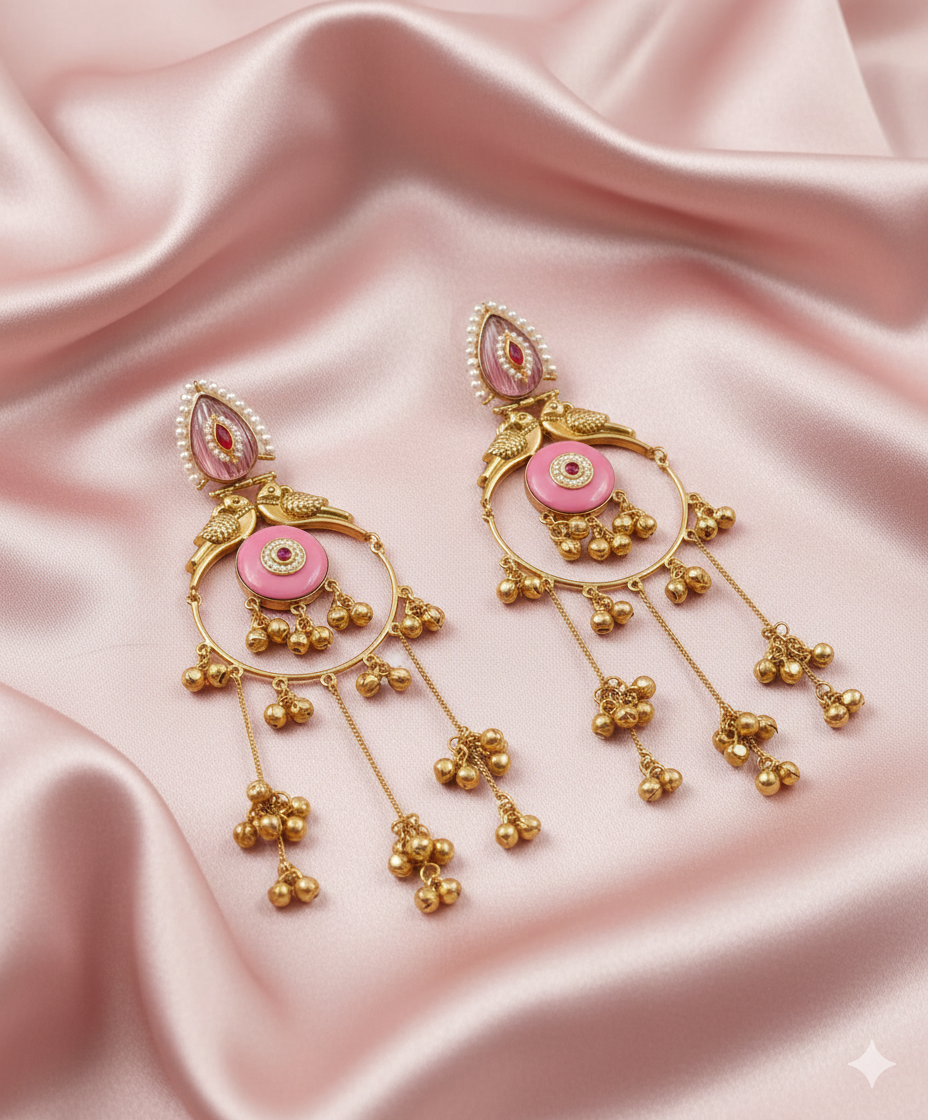 Made with a premium silver look-alike base and high-quality gold polish, these earrings offer a luxurious appearance while remaining lightweight and comfortable to wear. Their soft pink and gold colour combination makes them perfect for pairing with sarees, lehengas, anarkalis, and pastel ethnic outfits.