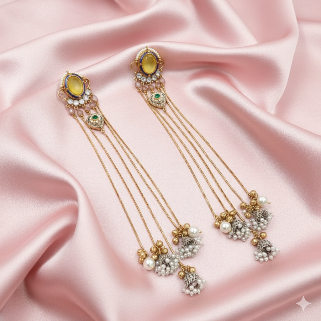 The long, layered design adds movement and richness, making these earrings ideal for festive occasions, weddings, and ethnic celebrations. They pair effortlessly with sarees, lehengas, and traditional suits, adding elegance without overpowering the outfit.