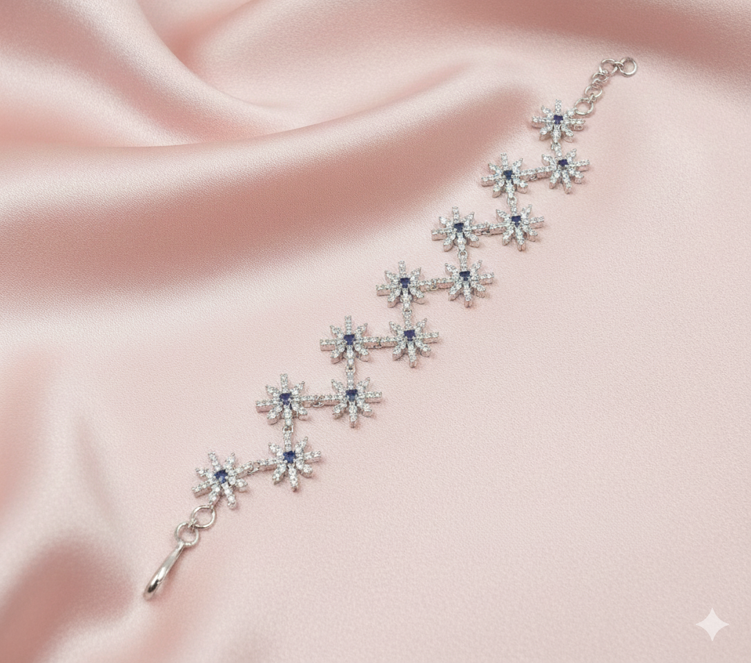 Enhance your jewellery collection with this beautifully designed Silver & Blue Floral AD Bracelet, crafted to deliver timeless elegance with a modern colour touch. The bracelet features a series of finely detailed floral motifs, each embellished with clear white American Diamond (AD) stones and highlighted by a deep blue centre stone, creating a striking yet balanced contrast.
