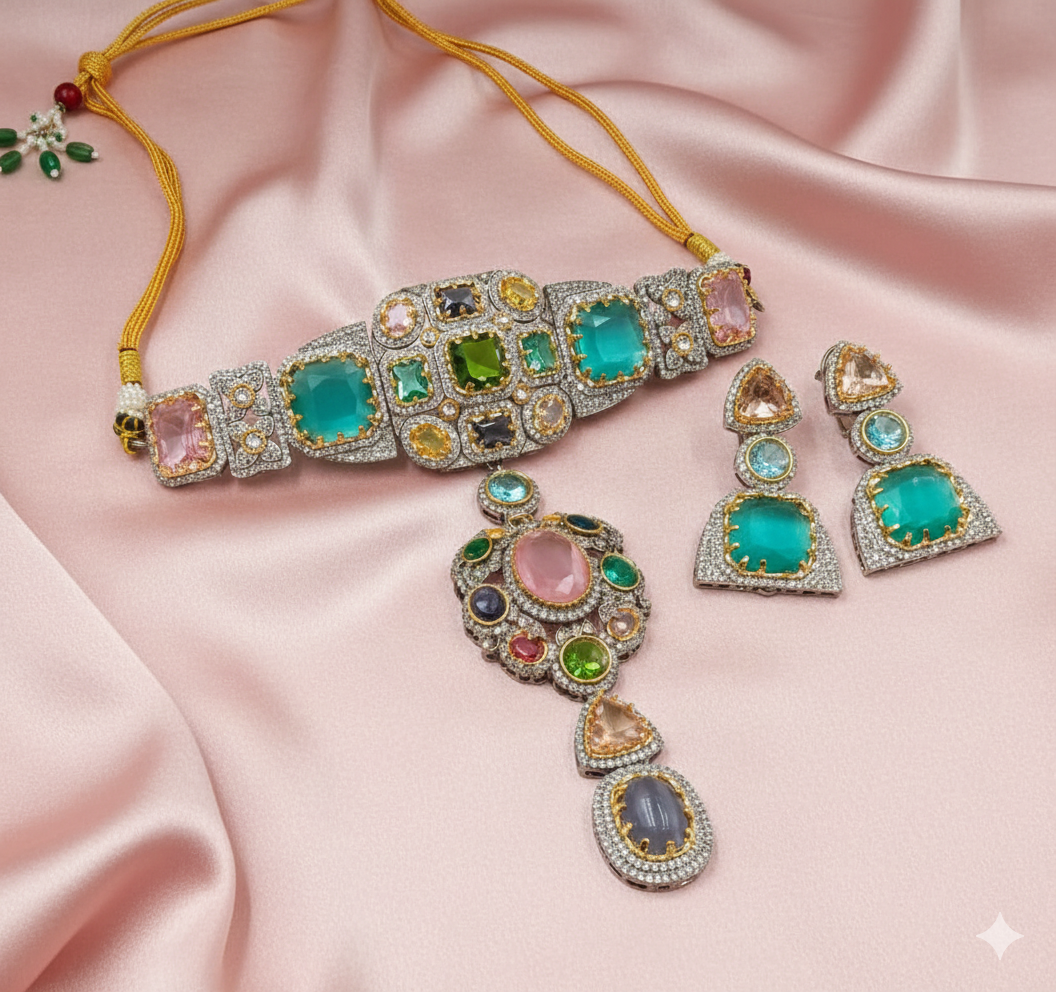 Embrace a look of serene luxury with the Misty Sage Mosaic Set. This masterfully crafted choker features large, cushion-cut stones that display a beautiful “frozen marble” effect in shades of mint and soft grey. Each stone is meticulously framed by a double row of micro-pave cubic zirconia, providing a continuous shimmer that mimics high-end diamond jewelry. The lower edge is adorned with a fringe of lustrous teardrop pearls, adding a classic traditional touch to this contemporary design.