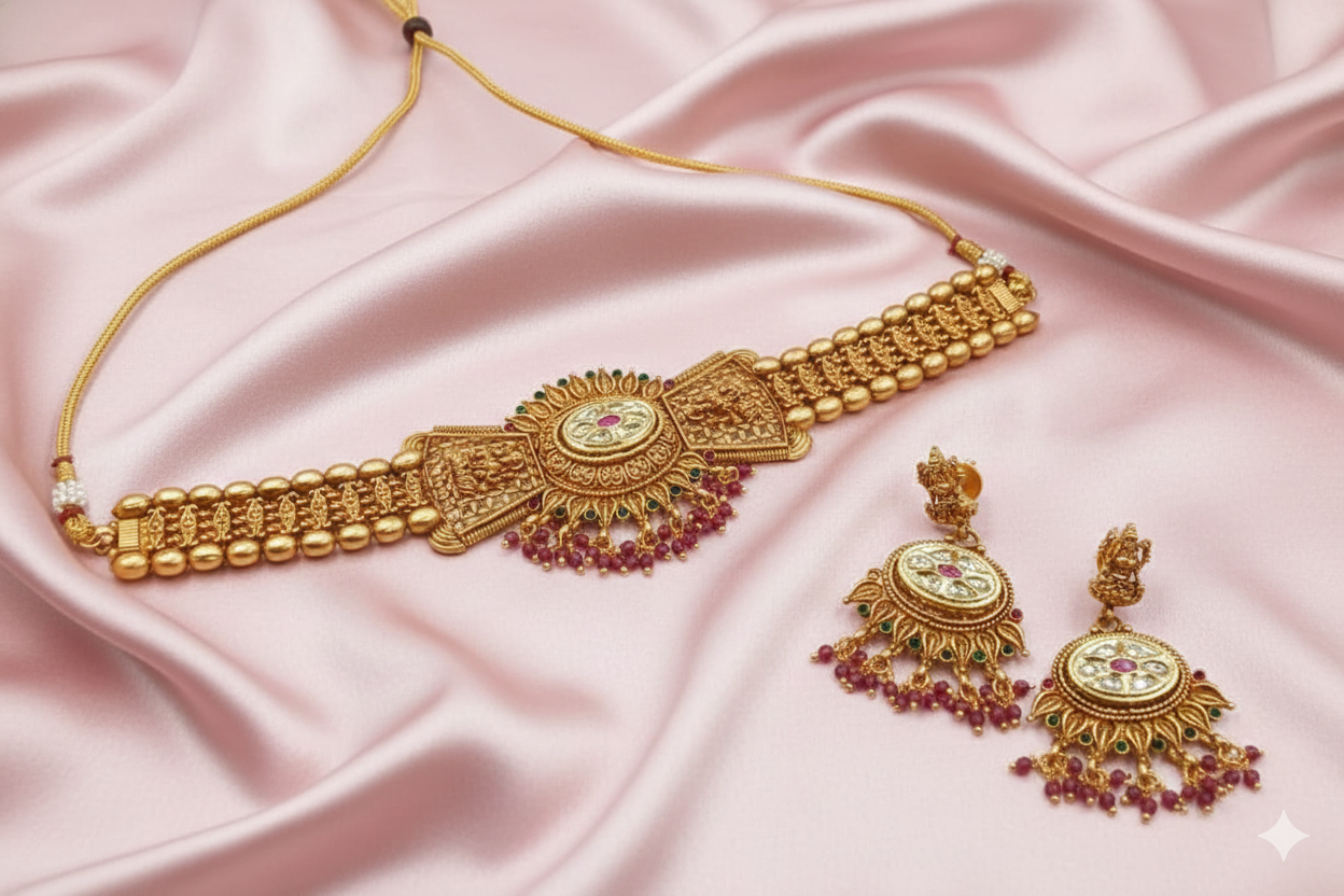 Paired with matching earrings, this set is perfect for weddings, bridal wear, festivals, and traditional occasions. The short-length choker sits elegantly on the neckline, making it an ideal choice with silk sarees, lehengas, and ethnic outfits. A timeless piece that reflects heritage charm and royal elegance.