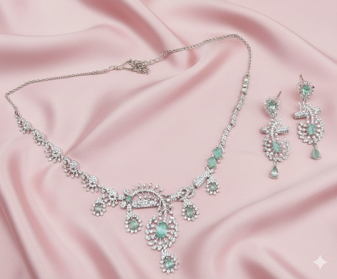 This heritage-style necklace set pays homage to traditional royal craftsmanship. The piece features high-quality clear stones set into a rich, antique gold-finished base, separated by exquisite floral engraving work. Paired with statement jhumka earrings, this set is ideal for bridal or high-profile festive wear.