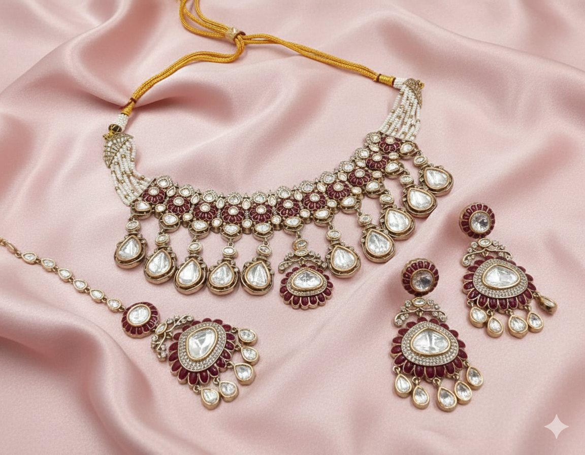 Soft pearl strands add a graceful contrast to the bold maroon tones, while the cascading crystal drops create movement and a luxurious finish. The matching earrings mirror the same maroon, white crystal, and pearl combination, creating a perfectly coordinated and refined look. An adjustable golden dori ensures a comfortable and secure fit.