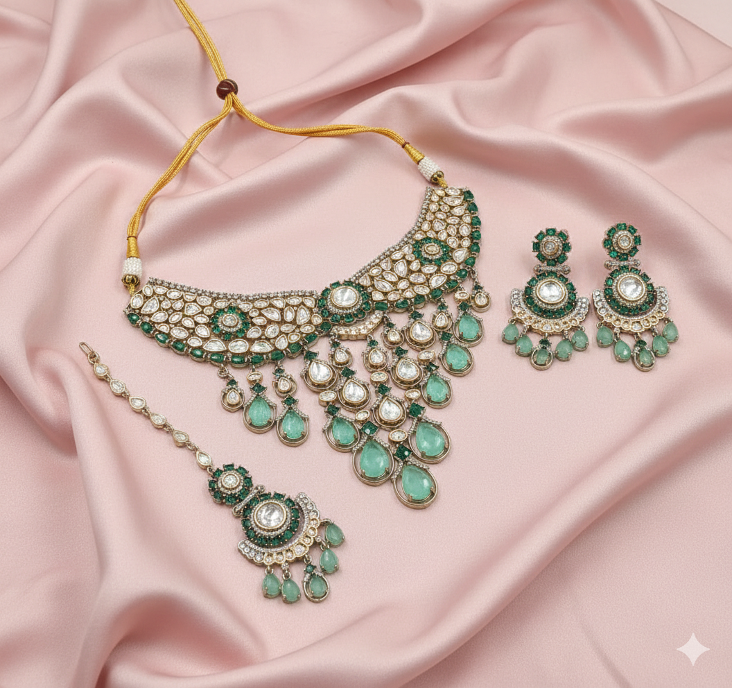 The highlight of the set is the cascading sea-green teardrop stones, which add fluidity, charm, and a graceful movement to the necklace. The matching earrings and maang tikka mirror the same sea-green, emerald, and white crystal detailing, creating a perfectly coordinated and refined ensemble. An adjustable golden dori ensures a comfortable and secure fit.