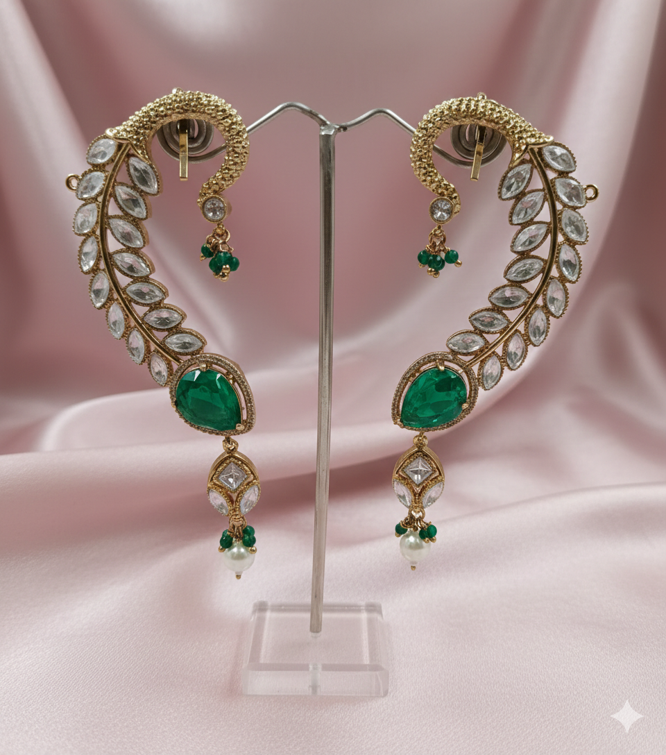 The earcuffs feature a majestic sweep of marquise-cut Moissanite stones that lead to a captivating emerald green pear-shaped focal point. The gold-tone setting is finished with a detailed, textured “rope” pattern along the top curve, adding an antique artisanal touch. Finished with delicate bead and pearl droplets that offer subtle movement, these earcuffs are the ultimate accessory for weddings, grand receptions, or festive celebrations where you want to make an unforgettable impression.