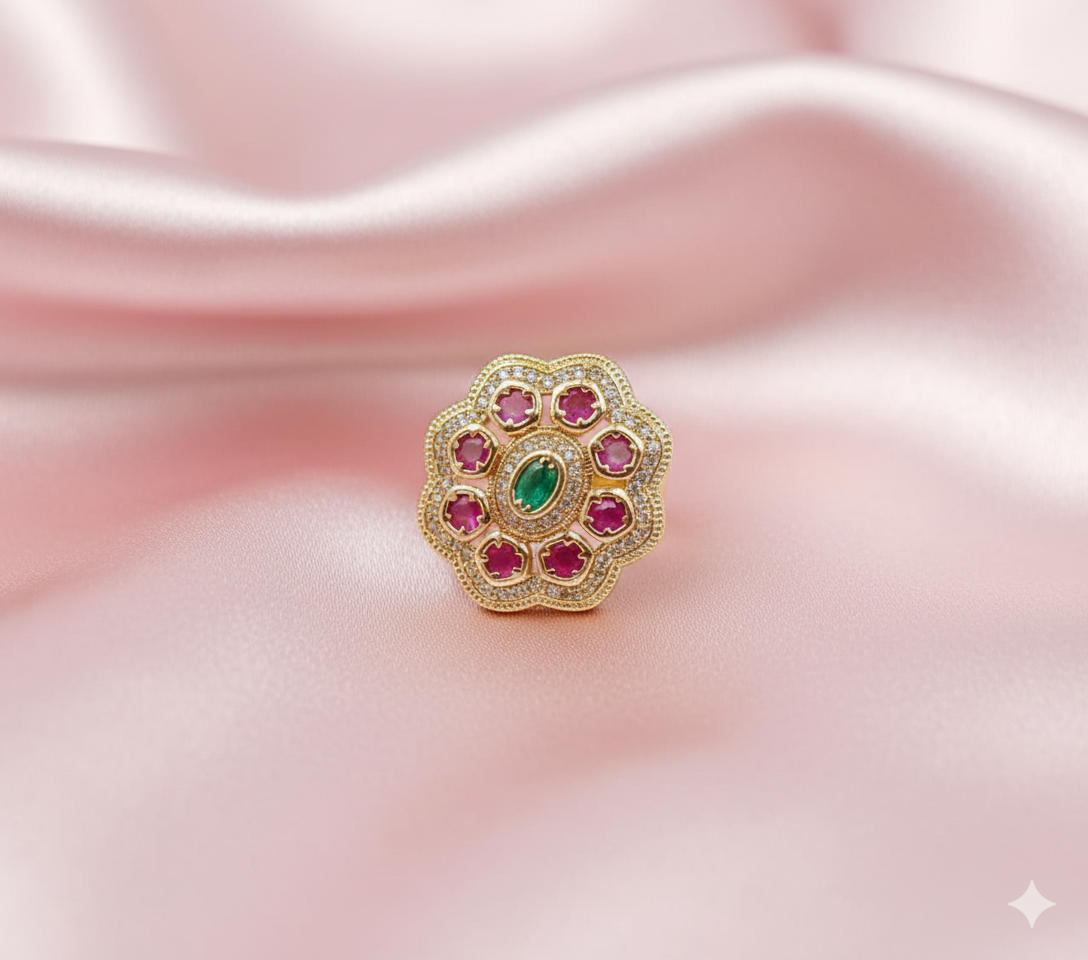 Step into elegance with the Viraat Kundan Ring. This exquisite piece centers on a striking star-shaped gemstone—available in deep emerald or royal ruby—framed by a traditional Kundan floral arrangement. The vintage gold-toned finish is highlighted by a halo of tiny white seed pearls, creating a sophisticated silhouette. Designed with an adjustable band, this ring is the perfect heirloom-inspired accessory for weddings, festivals, and grand celebrations.